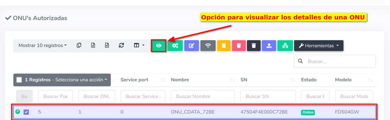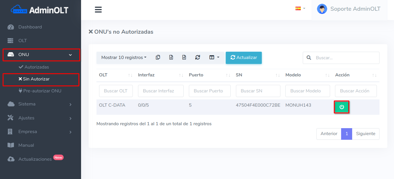 1Para ver los dispositivos que aún no han sido autorizados, debemos dirigirnos a la sección ONU > Sin Autorizar y seleccionar alguna ONU disponible.