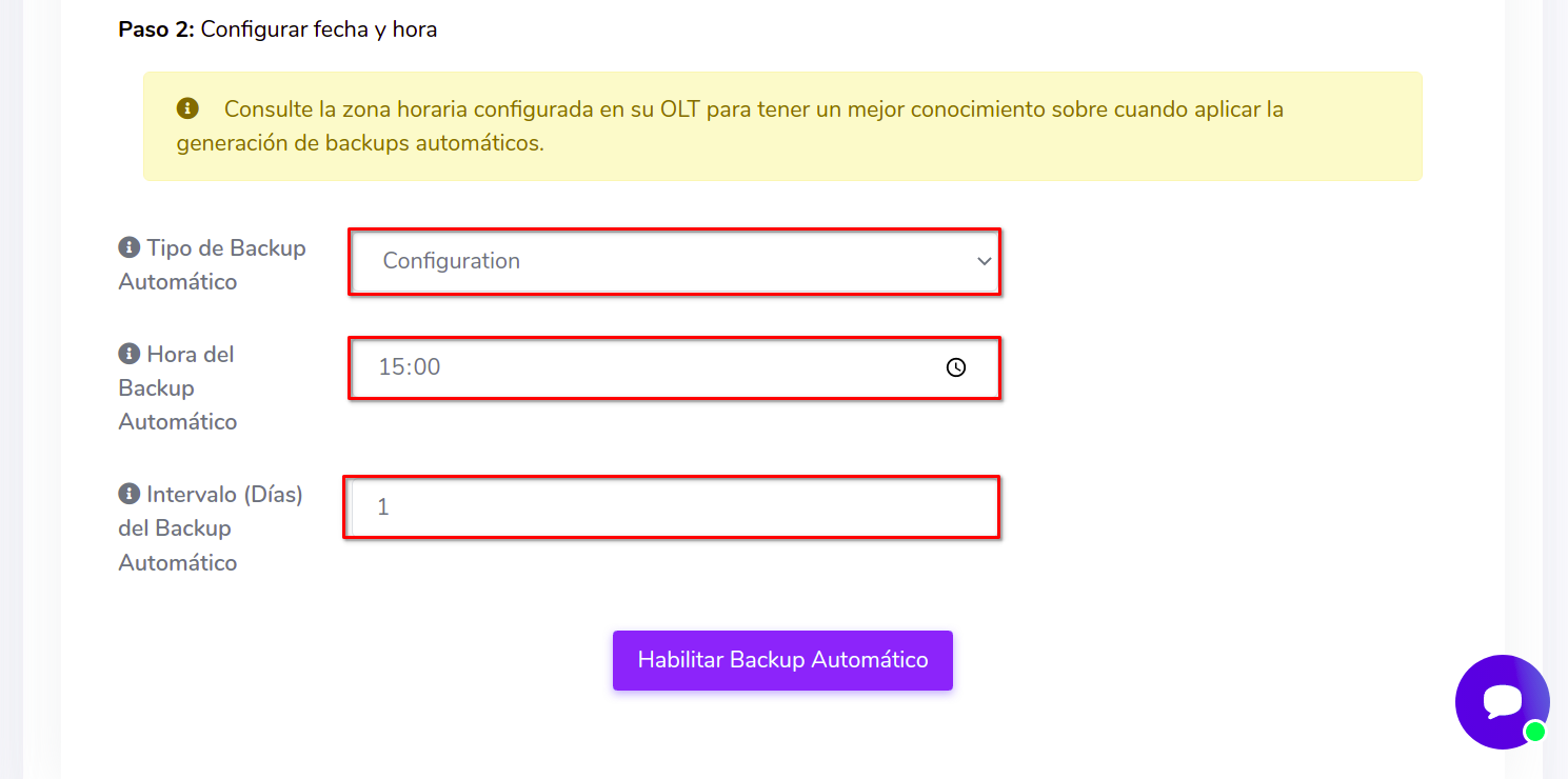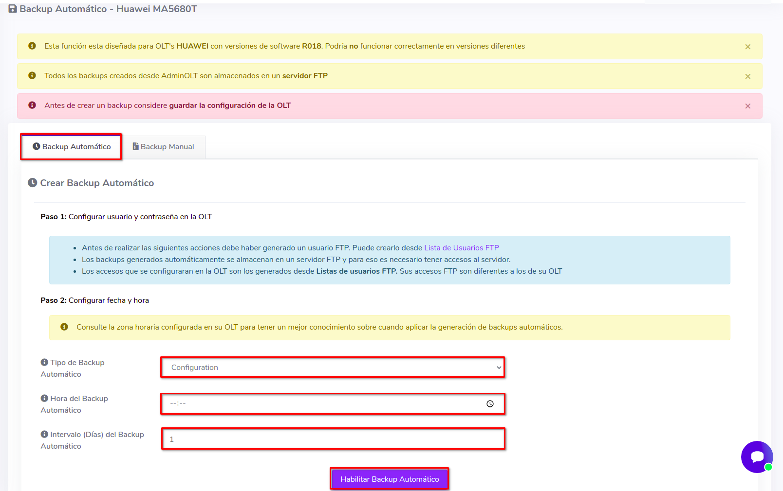 - Tipo de Backup Automático: AdminOLT ofrece: Configuration y Data