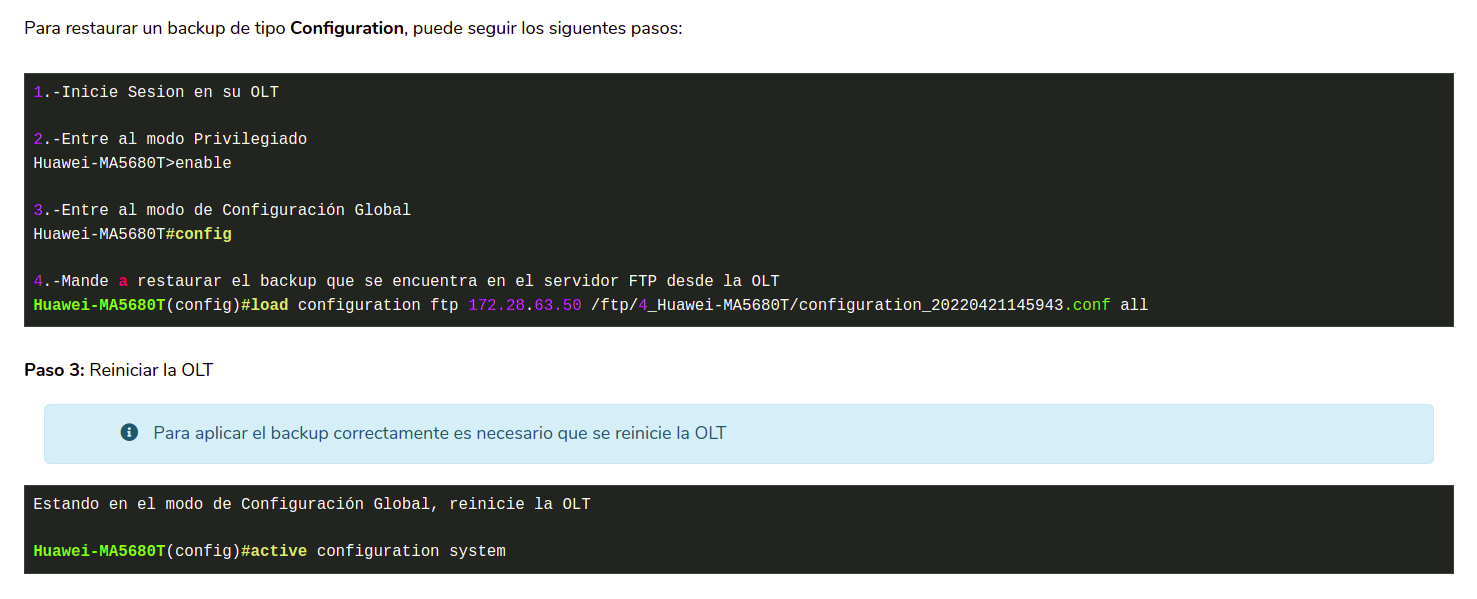 Las OLTs tienen la capacidad de hacer respaldos automáticos o si lo desea puede mandarlos a crear manualmente. Puede leer más sobre estas opciones en los siguientes enlaces: