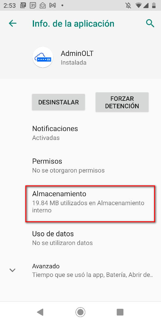 2Vamos a información de la aplicación y seleccionaremos la opción Almacenamiento.
