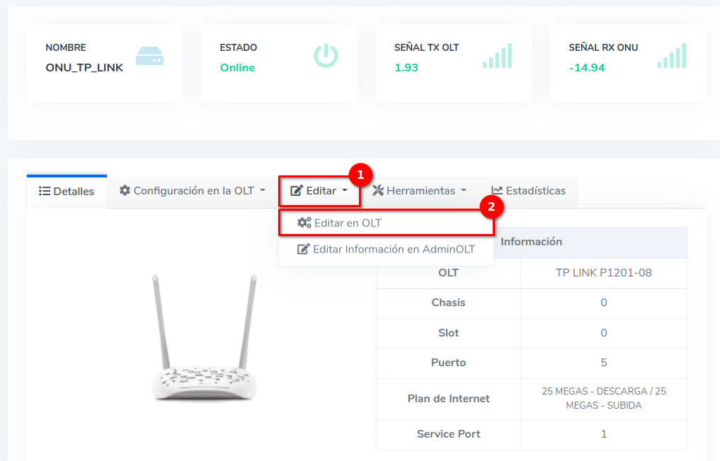 Dar click en el texto Editar en OLT que se encuentra en el botón con la leyenda Editar.
