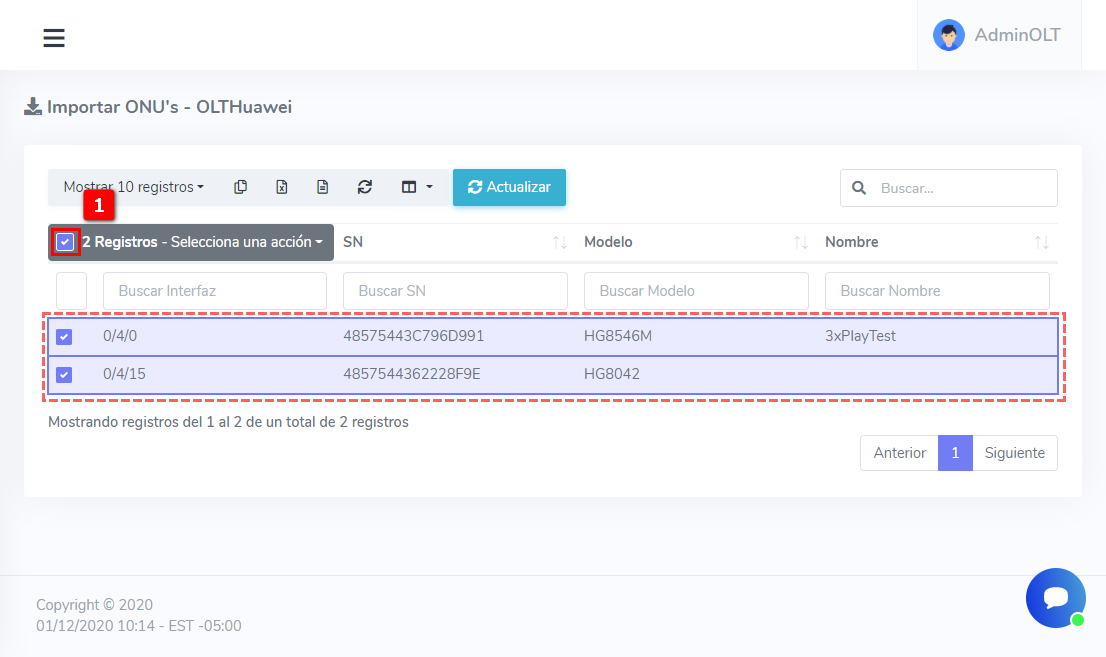 2Se nos mostrara un listado de los equipos que ya están autorizados en su olt por lo que toca seleccionar dichos equipos que queramos importar. Para seleccionar los equipos podemos hacerlo en lotes ósea seleccionando varios a la vez o bien uno a uno.