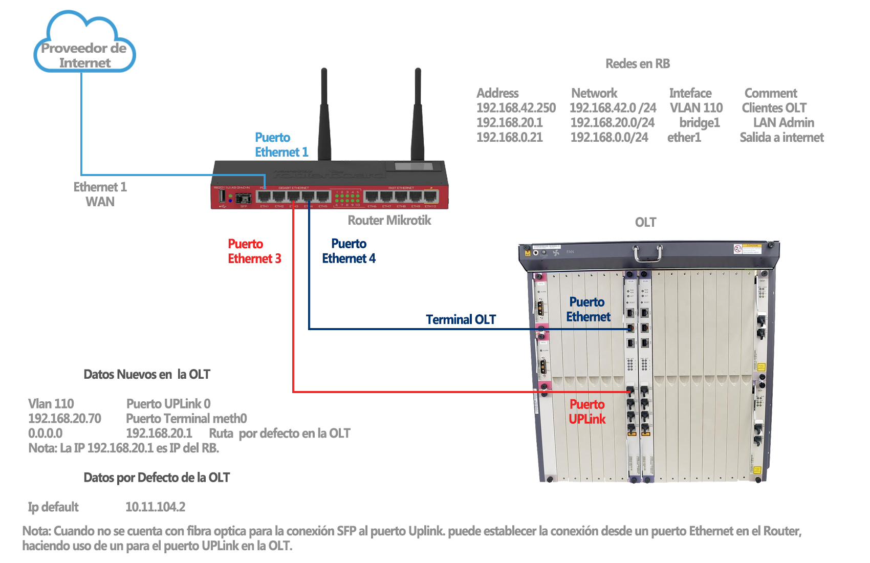 Para tener mas clara como se estructura la conexión de la OLT al momento de realizar la configuración, puede apoyarse de los siguientes dos diagramas, con dos escenarios sobre como realizar la conexión física.