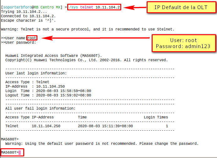4.1 Ingresar por SSH con los datos default de la OLT.