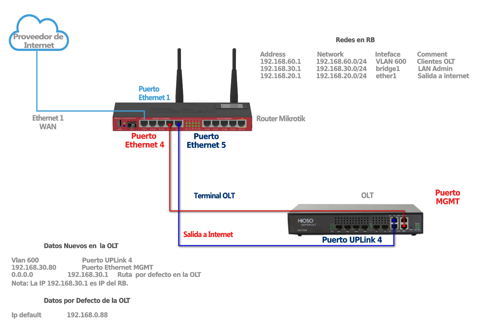 Para tener más clara como se estructura la conexión de la OLT al momento de realizar la configuración, puede apoyarse del siguiente diagrama, sobre como realizar la conexión física.