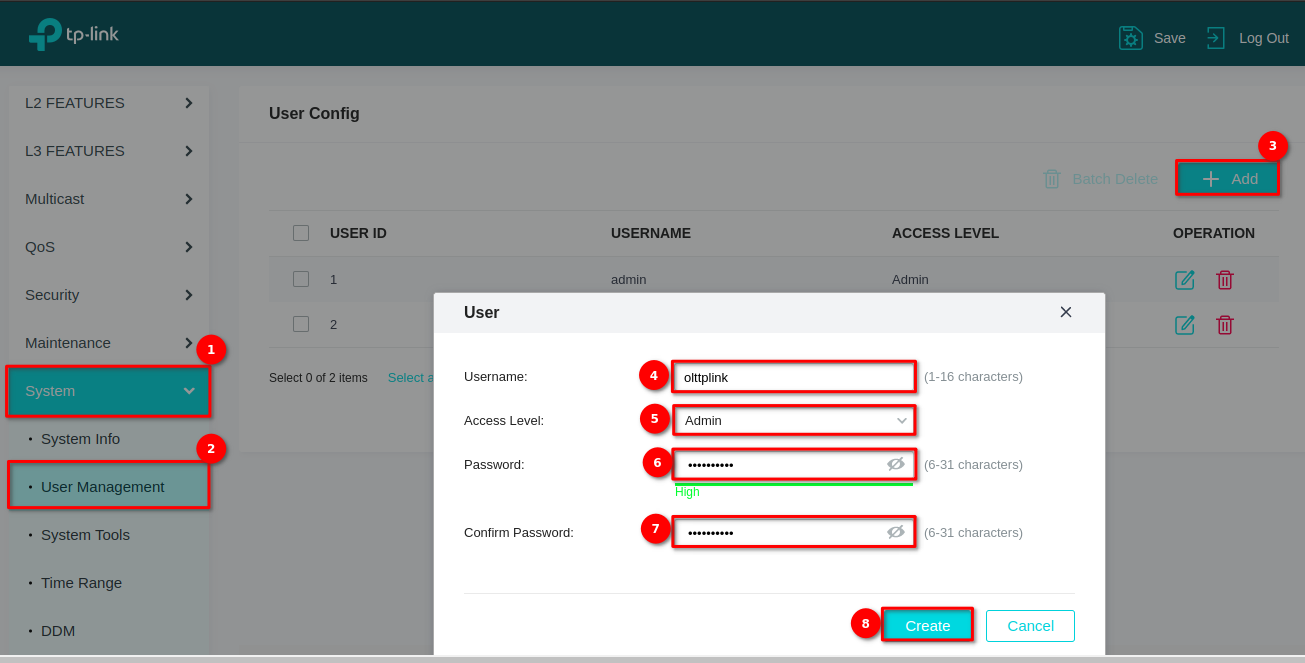 Por seguridad es necesario crear un usuario en la OLT, el cual nos servirá para conectarlo con AdminOLT
