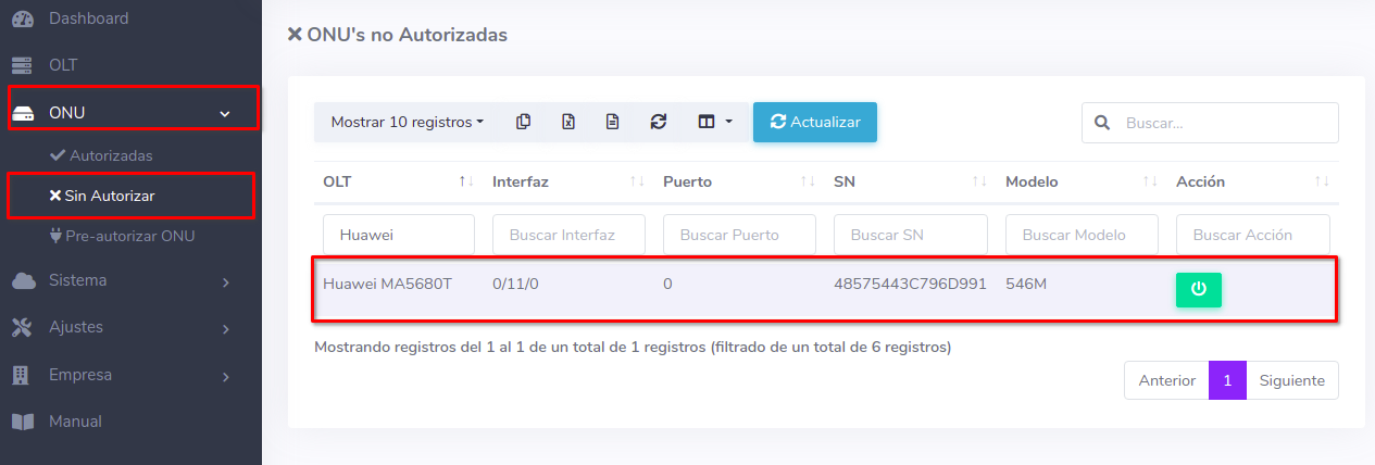 - Onu Autorizada en la OLT. Ver más detalles