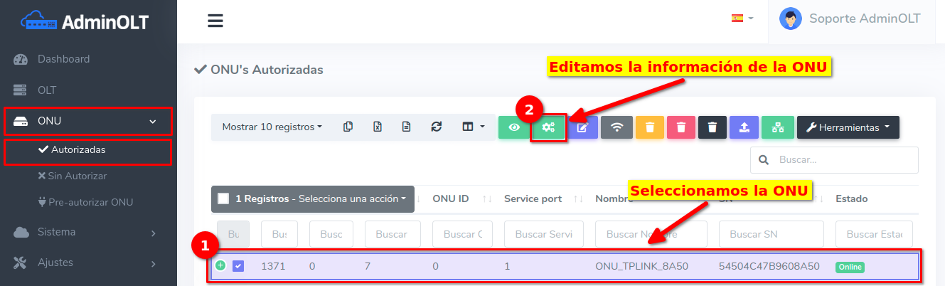 Pasos para editar información de ONU Autorizada por SN