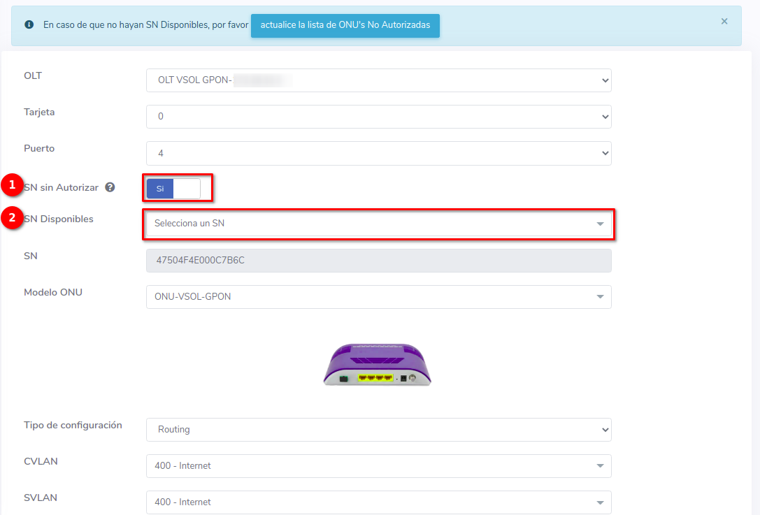 En AdminOLT podemos editar información de una ONU Autorizada en la OLT, supongamos que alguna de las ONUs que tenemos autorizadas en el sistema se estropea. Tomaremos como ejemplo esta situacion para explicar el propósito de esta función. Asi que en ese caso en AdminOLT al editar ONU por SN podemos tomar información de alguna ONU no Autorizada y usarla, sin perder la configuración inicial que teníamos.