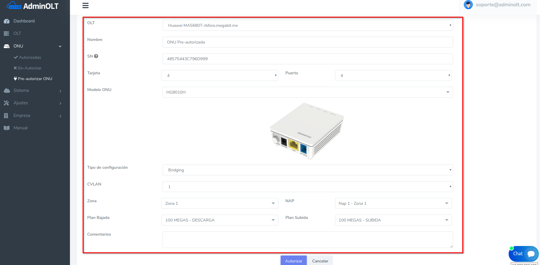 4Una vez completó el formulario, de click en "Autorizar". Sera redirigido a la lista de ONU's donde podrá visualizar los datos de la ONU que ingresó en el formulario.