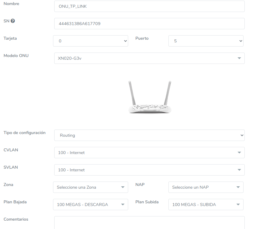 Es necesario que como primer paso sea seleccionar la OLT donde se realizara la acción. Al momento de seleccionar alguna OLT, se autocompletarán algunos datos del formulario, por ejemplo Tarjetas, Puertos o VLAN.