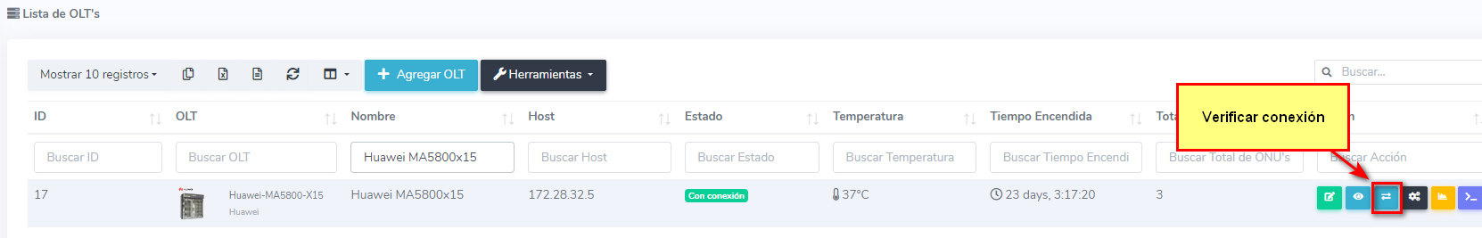 4Dirigirse a la Lista de OLT y Verificar conexión