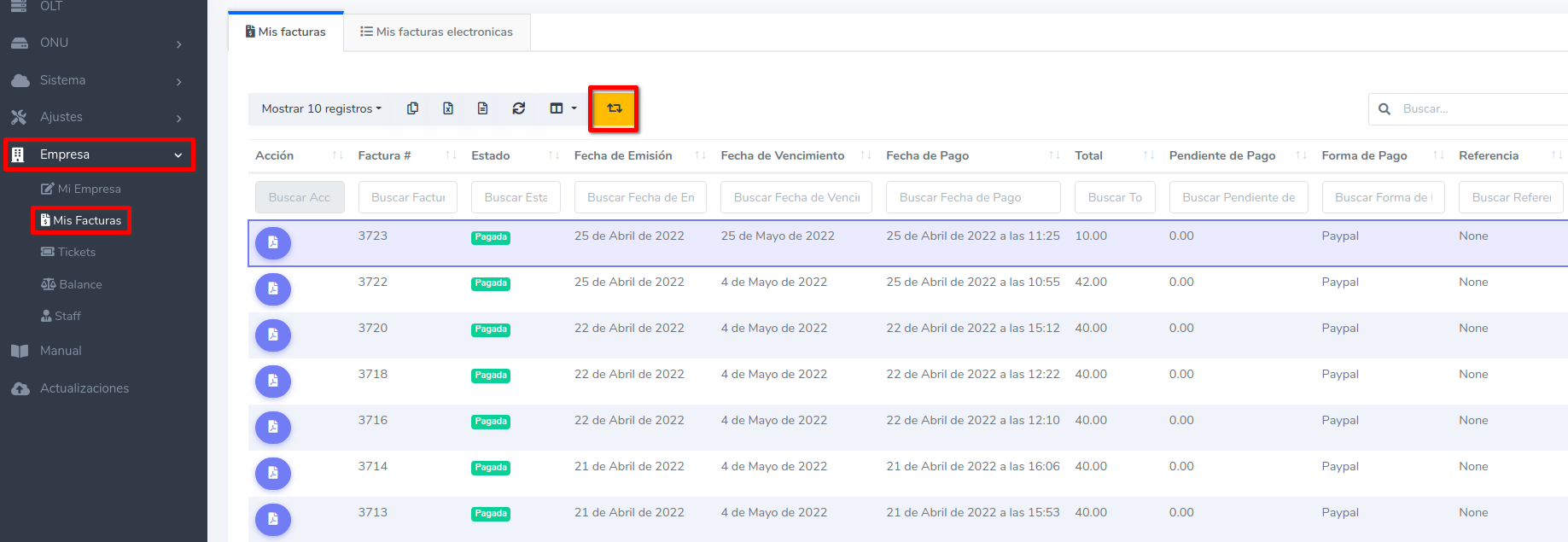 Tiene que seleccionar una factura para que aparezca el botón amarillo de generar factura electrónica.El cual lo redireccionará a la pantalla de timbrado.